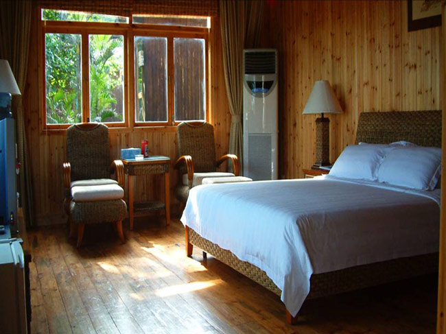 三亞蜈支洲島度假中心屬熱帶海洋性氣候,全年溫和氣爽,四季怡人。由于小島地處三亞海棠灣,避開了臺風(fēng)走廊,所以不同于一般只能生長灌木的北部小島,這里喬木高大挺拔,灌木繁茂葳蕤,如天然織就的一塊厚重的綠毯披在島上,麗質(zhì)天成。小島地貌美麗而有層次:島的中部坡地逶迤,起伏平緩,草木紛亂,藤蔓纏結(jié),花紫果綠,蟬噪鳥鳴。西部及北部平緩延伸入海,形成一彎路玉帶狀的銀色沙灘,沙質(zhì)均勻細(xì)膩,色澤潔白如雪,海水由淺入深,顏色由透明而碧綠繼而淺藍(lán),后而深藍(lán),明麗動人層次分明。東部與南部則是現(xiàn)兩峰相連,最高峰海拔79.9米,其氣勢與洶涌仄相向,懸崖壁立如削,人跡難至,其下礁石林立,奇形萬狀,驚濤拍岸,泡沫如雪。大風(fēng)或大潮時,海浪咆哮奔騰激起的浪花可高達(dá)十米,形成獨(dú)特的山海奇觀。小島現(xiàn)已被開發(fā)了三分之一,都位于西北部。建設(shè)者獨(dú)具匠心,巧妙地利用了地形地貌,使人工設(shè)施掩映期間,不減其風(fēng)采,反增其情趣。這里椰影婆娑,綠草成蔭,竹制建筑娉婷綽約,泳池碧波蕩漾。草地上小徑蜿蜒,點(diǎn)綴些秋千、蹺蹺板、石凳、竹制躺椅,編就了一幅世外天堂的畫面。